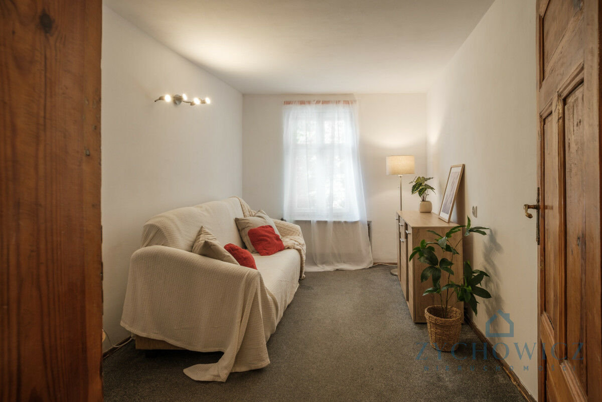 W mieszkaniu zachowana jest oryginalna drewniana stolarka i przedwojenna deska podłogowa (obecnie przykryta panelami i wykładziną). To elementy, które nadają wnętrzu autentyczność i wyróżniają je na tle innych ofert.