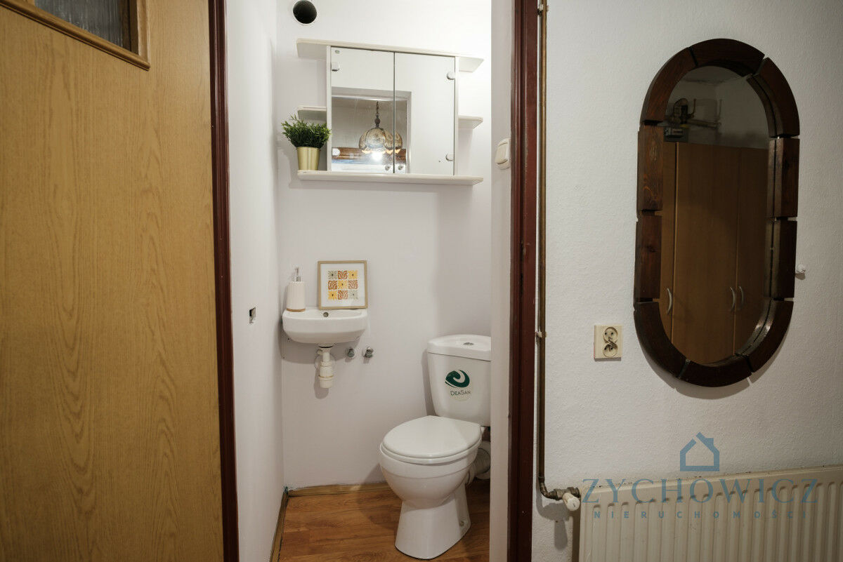 Obecnie kabina prysznicowa znajduje się w kuchni, jednak układ mieszkania pozwala na wydzielenie komfortowej łazienki oraz oddzielnej kuchni. Przylegające pomieszczenie (dawna kotłownia, która nie pełni już swojej funkcji) daje szerokie możliwości zaplanowania funkcjonalnego układu - co znacząco zwiększa wartość i wygodę mieszkania.