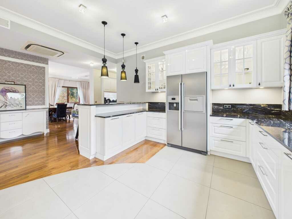 Otwarta, duża kuchnia zachwyca granitowymi blatami i pełną