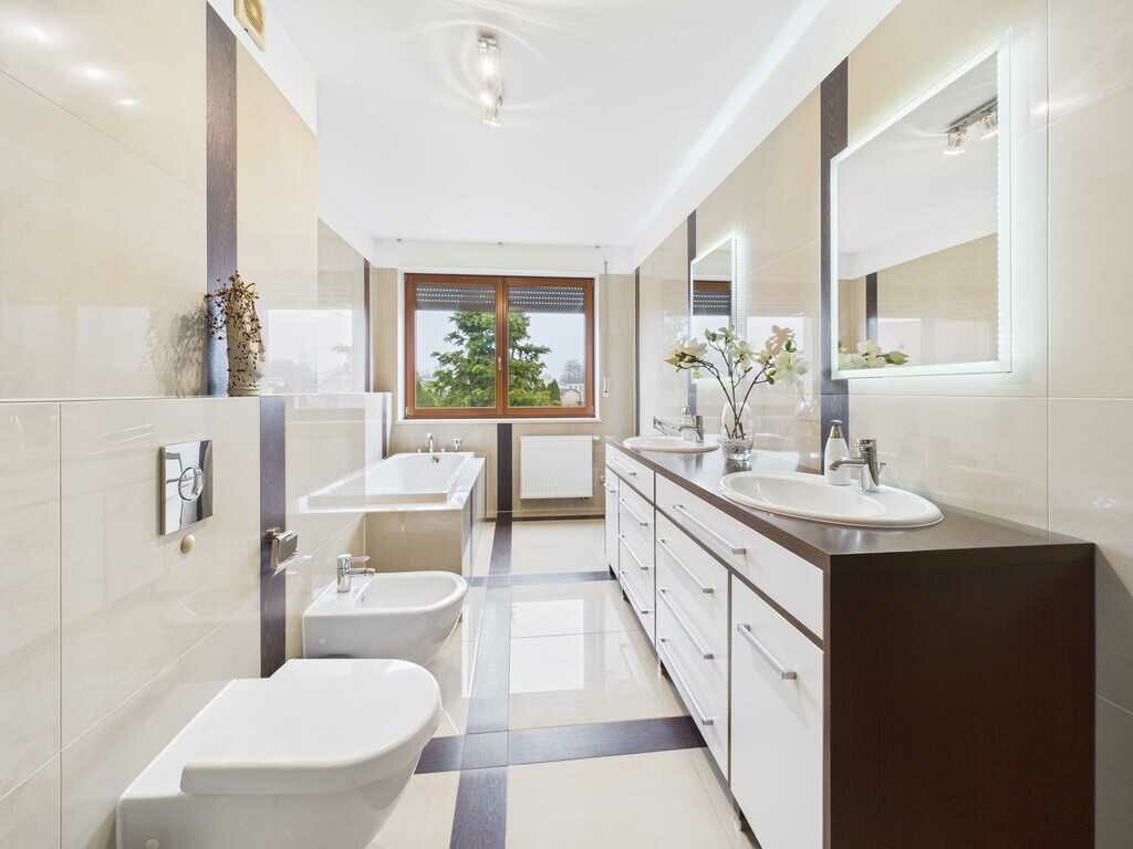 dwie łazienki – jedna wyposażona w wannę i prysznic, druga w